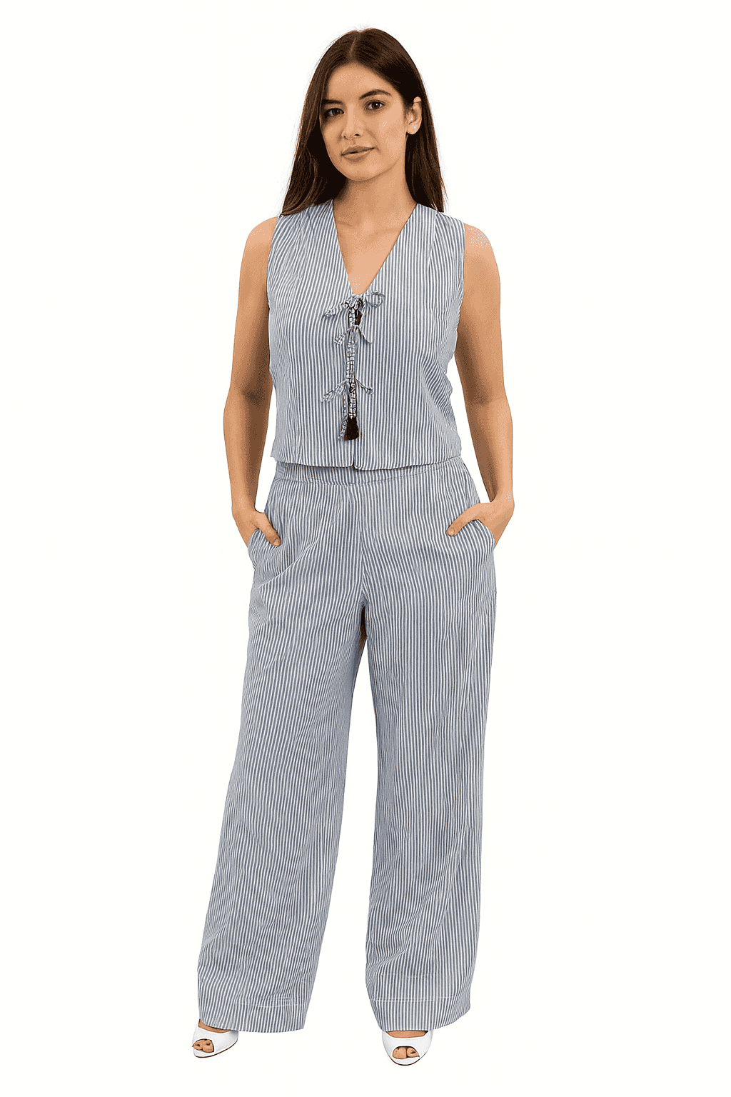 Esse conjunto é a união perfeita entre conforto e sofisticação. O top sem mangas com amarração frontal traz charme e praticidade, dispõe de tecido que dá segurança ao transpasse; enquanto que, a calça reta e de cintura alta garante leveza e um caimento impecável. Ideal para quem busca um visual moderno e fresco, sem abrir mão da elegância.