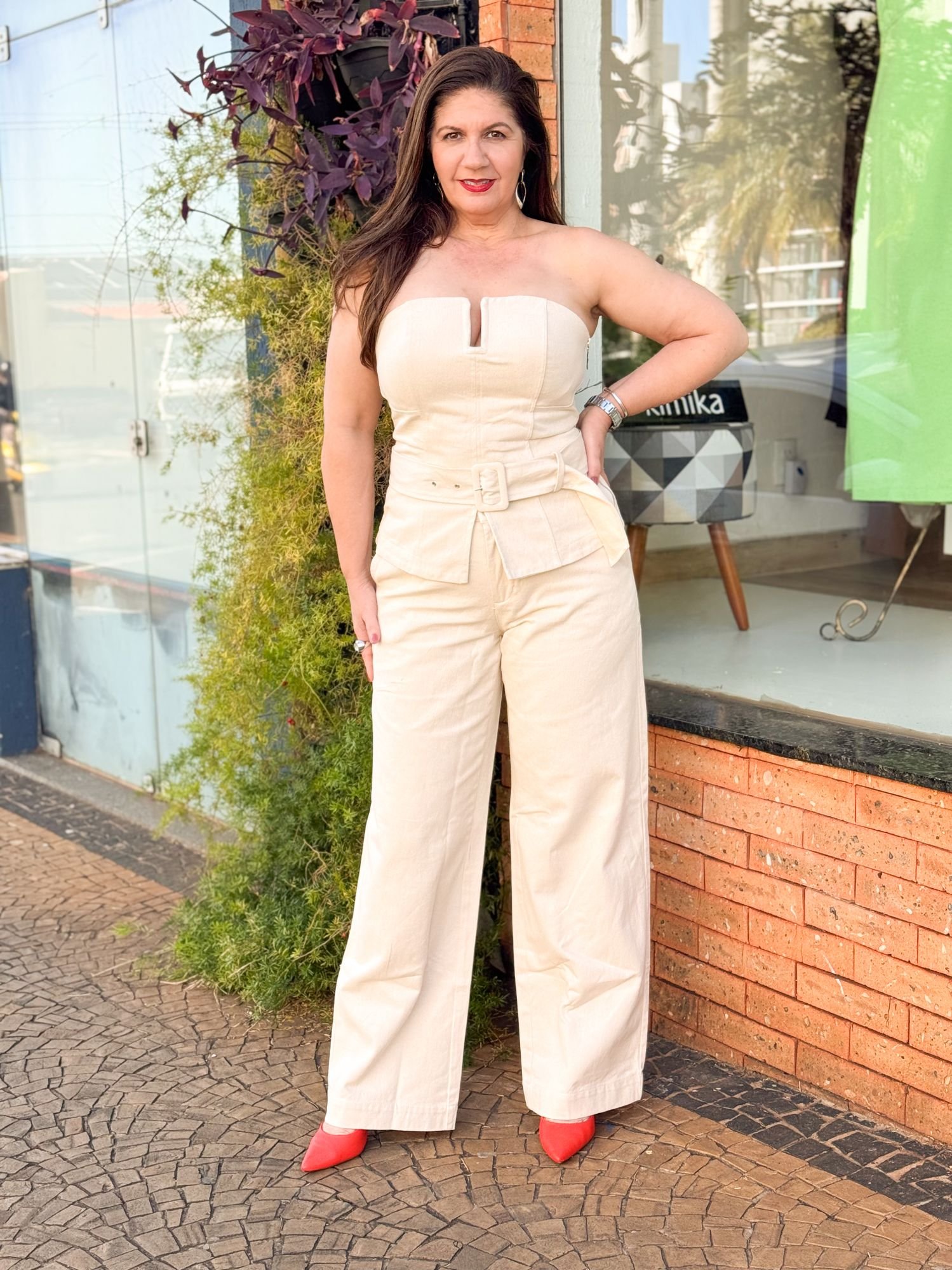 Conjunto confeccionado em sarja estruturada com elastano, que oferece firmeza, conforto e caimento impecável. A blusa estilo corset valoriza a silhueta com recorte ajustado, detalhe de decote reto e zíper lateral que facilita o vestir. Possui elástico na parte posterior, garantindo melhor adaptação ao corpo. A calça de cintura alta apresenta modelagem reta, bolsos utilitários e faixa com fivela, trazendo modernidade e sofisticação ao conjunto. Um look poderoso, com equilíbrio entre estrutura e elegância, perfeito para quem ama peças com presença e caimento impecável.